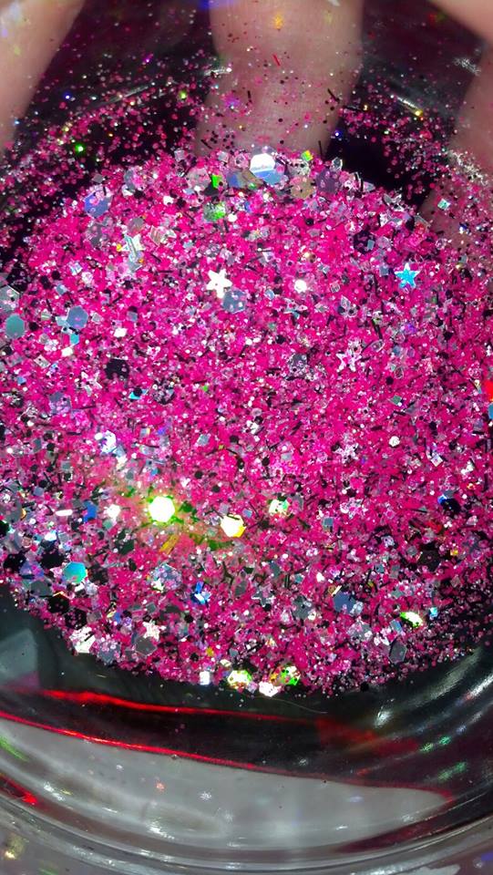 This is my rocker pink mix. Its pretty chunky mix. It has hot pink glitter mixed with black glitter and some holographic silver, pink and black hexis and silver holographic stars in it.